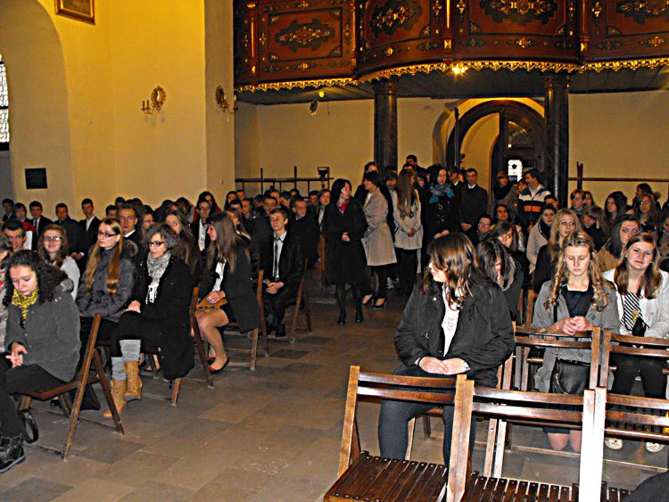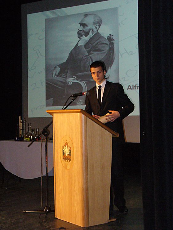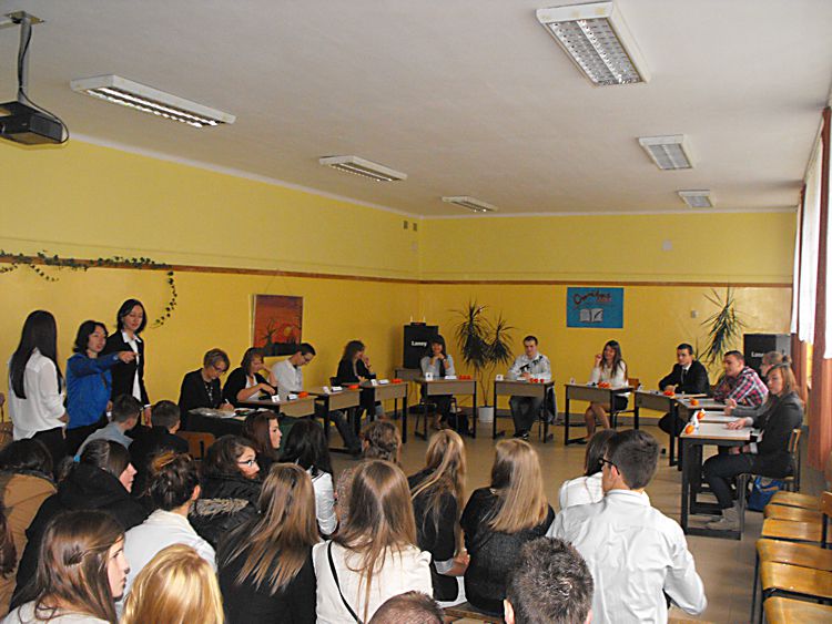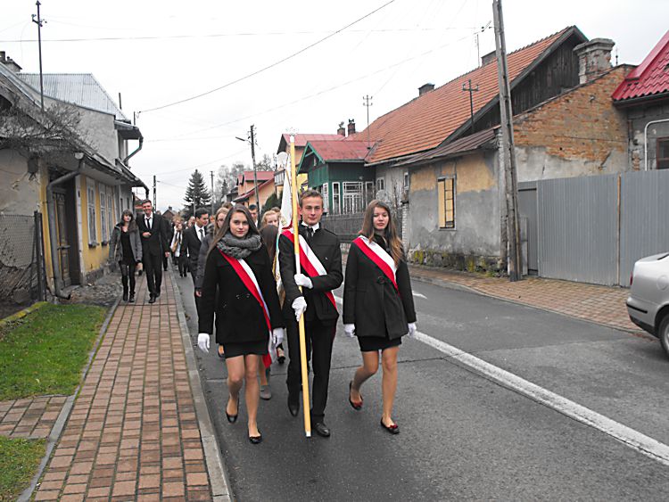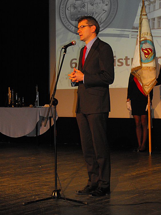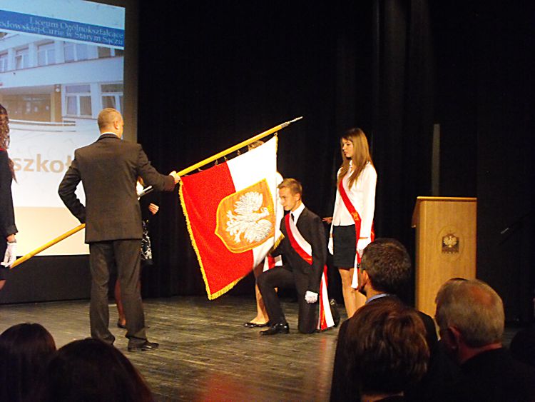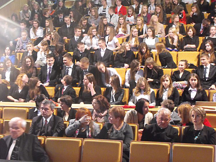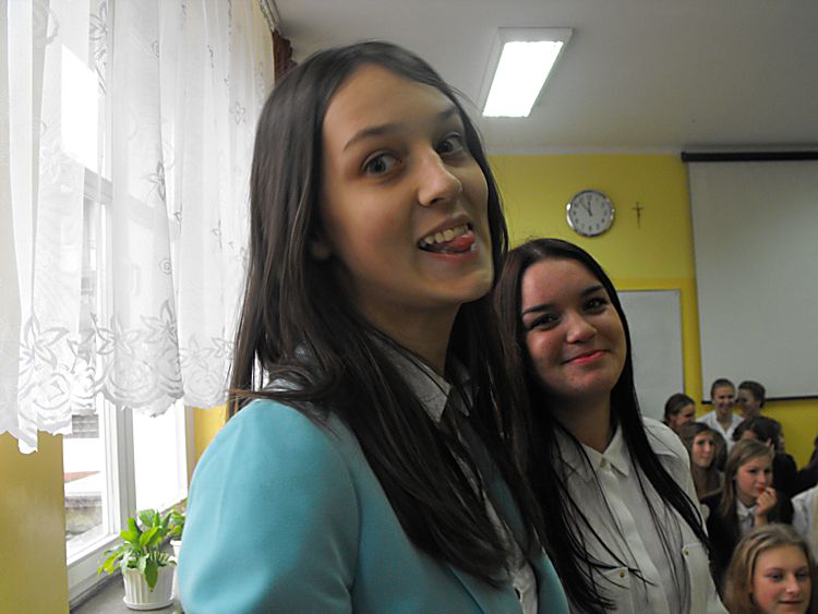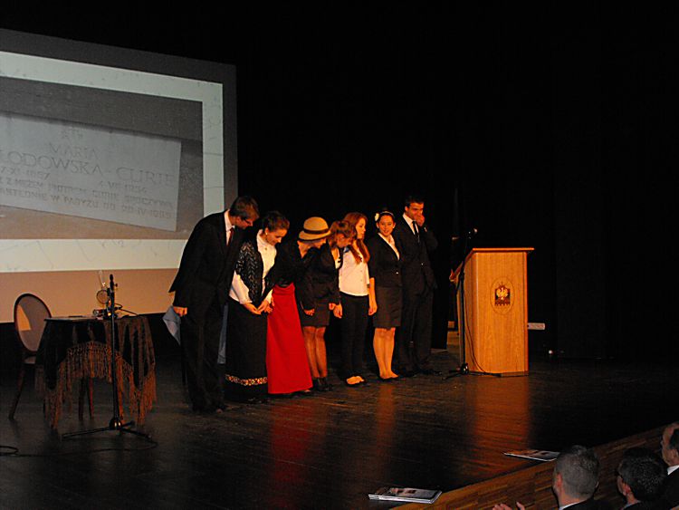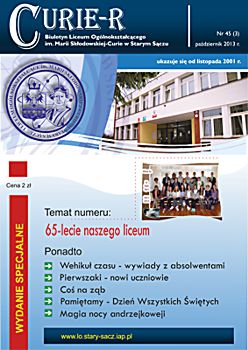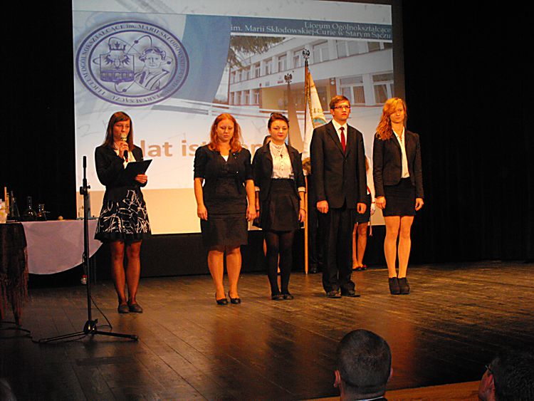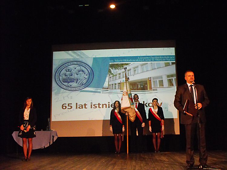 65 lecie starosądeckiego liceum Liceum Ogólnokształcące im. Marii Skłodowskiej–Curie w Starym Sączu tradycyjnie w listopadzie obchodzi święto szkoły. Tak też było w tym roku, bowiem 6 listopada cała społeczność szkolna: dyrekcja, grono pedagogiczne, uczniowie i rodzice zebrała się, by oddać hołd patronce szkoły, dwukrotnej laureatce nagrody Nobla – Marii Skłodowskiej–Curie. Tegoroczne święto to też mały jubileusz szkoły, która od 65 lat uczy, wychowuje i kształtuje kolejne pokolenia uczniów. Tradycyjnie, na czele ze sztandarem liceum, udano się do kościoła parafialnego pw. św. Elżbiety, gdzie mszę świętą odprawił proboszcz parafii a zarazem katecheta w LO – ks. Marek Tabor. Jak zawsze homilia wygłoszona przez księdza proboszcza, która w tym roku opierała się na 10 przykazaniach studenta i stanowiła o wielkiej mocy słowa i potrzebie wspólnoty, wywołała u słuchaczy wielkie zainteresowanie. Oprawą muzyczną mszy świętej zajął się pan Mieczysław Zagórowski, który razem z zespołem JP II rozśpiewał naszą szkolną brać. Potem społeczność szkolna i zaproszeni goście udali się do sali starosądeckiego „Sokoła”. Swoja obecnością uroczystość uświetnili: burmistrz Starego Sącza – Jacek Lelek, przedstawiciele władz powiatu nowosądeckiego, dyrektorzy okolicznych szkół ponadgimnazjalnych i gimnazjów, byli dyrektorzy liceum oraz przybyła delegacja z zaprzyjaźnionej szkoły ze Słowacji – Spiskiej Nowej Wsi. Spotkanie rozpoczęło się od wystąpienia dyrektora szkoły – mgr Krzysztofa Szewczyka i zaproszonych gości. Dyrektor podkreślił, że tegoroczne święto szkoły, to okazja do wspomnień, przypomnienia początków szkoły, która od 65 lat kształci młodzież z okolicznych miejscowości. Goście życzyli przede wszystkim wysokich wyników w nauce, ale nie zapomnieli o tym, by rzec, że szkoła to nie tylko nauka, ale przede wszystkim tradycja, ceremoniał szkolny i atmosfera. Pan Dyrektor przypomniał też początki współpracy z Gimnazjum ze Spiskiej Nowej Wsi, ponieważ w tym roku mija 10 lat od podpisania porozumienia o współpracy obu szkół. Przyjaciele ze Słowacji każdego roku towarzyszą nam w obchodach święta szkoły, dlatego też z tej okazji otrzymali pamiątkę, którą odebrała zastępca dyrektora szkoły. Potem nastąpiło uroczyste ślubowanie uczniów klas I. Podniosła atmosfera i uroczysta chwila tego wydarzenia sprawiły, że wszyscy uczniowie z powagą ślubowali wierność szkole i patronce: Marii Skłodowskiej–Curie. Uczniowska Rada Szkoły wraz z opiekunami: panią Moniką Szczurek i Małgorzatą Stelmach przygotowały uroczyste przekazanie sztandaru nowemu pocztu sztandarowemu. Ceremonia ta pozwoliła zastanowić się nad rolą, jaką mają uczniowie, którzy ze sztandarem szkoły uczestniczą w wielu ważnych chwilach w dziejach szkoły, miasta i powiatu. Święto szkoły, to przede wszystkim czas, aby przypomnieć postać patronki, wielkiej kobiety, dwukrotnej laureatki nagrody Nobla. Spektakl, który poświęcony był Marii Skłodowskiej – Curie, wzbudził podziw wśród wszystkich obecnych na sali widowiskowej. Portret kobiety zniewalającej, intrygującej, kobiety, w życiu której jest tyle cech wielkich, że chciałoby się je opowiadać jak legendę wykreowany został przez uczniów liceum. Ich aktorska gra i wyczucie sytuacji oraz kreślenie kolejnych scen z życia noblistki spowodowały, że postać Marii na chwilę zagościła wśród nas. Na szczególne wyróżnienie zasługują Dominika Bieryt w roli Marii i Marta Jagieła w roli Ewy. Spektakl przygotowały nauczycielki języka polskiego: Iwona Rychlewska, Joanna Opyd, Małgorzata Jawor i Małgorzata Stelmach. Przedstawieniu towarzyszyła prezentacja multimedialna. Po oficjalnych uroczystościach ruszyliśmy kolumną do szkoły, by tam, zgodnie z tradycją naszego LO, uczestniczyć w konkursach przygotowanych z okazji obchodów święta szkoły. Odbyły się zatem: Omnibus, konkurs z wiedzy ogólnej, który w tym roku, jak i poprzednim, wygrała Anna Warcholak z klasy 3a i to ona otrzymała tytuł Omnibusa 2013 roku. Konkurs Młodych talentów zgromadził jak zwykle wielu uczestników i jeszcze więcej widzów. Uczniowie popisywali się śpiewem, tańcem i humorem, a tytuł zwycięscy przypadł Kamili Kurowskiej z 3 d. W tym roku też przeprowadzono konkurs o krajach anglojęzycznych, który cieszył się dużym zainteresowaniem wśród uczniów. Należało wykazać się wiedzą o historii, obyczajach i tradycjach między innymi Stanów Zjednoczonych i Wielkiej Brytanii. Wśród biorących udział w tym konkursie najwyżej uplasowała się Iwona Król z klasy 3 c i to ona zdobyła I miejsce. Z okazji święta szkoły klasa II c o profilu dziennikarskim wydała kolejny numer szkolnej gazetki Curie–r. Jest to numer specjalny, który związany jest z 65-leciem szkoły. Gazetka nabrała kolorów, została „obdarowana” kolorową okładką i wydrukowana w drukarni, co uczyniło ją profesjonalnym pismem. W tym roku opiekunem merytorycznym pisemka jest pani Iwona Rychlewska, a składem i oprawą graficzną zajmuje się pan Paweł Jochymek. I. Rych.