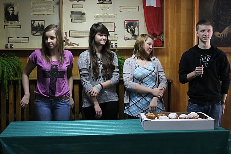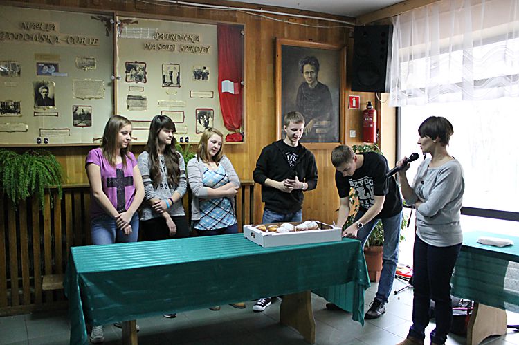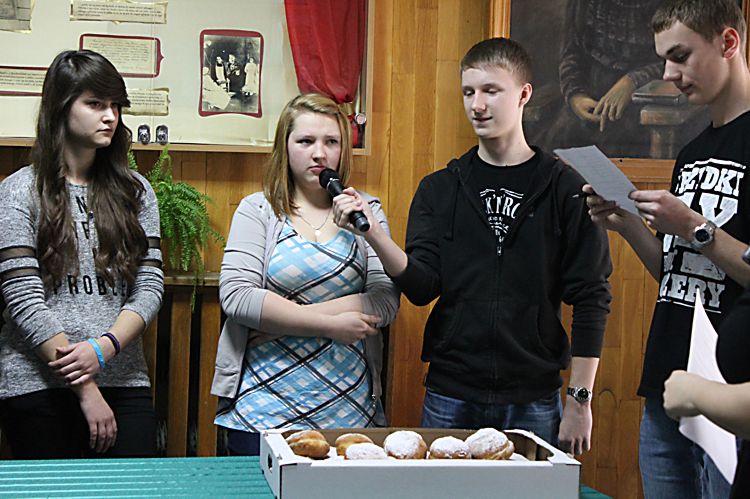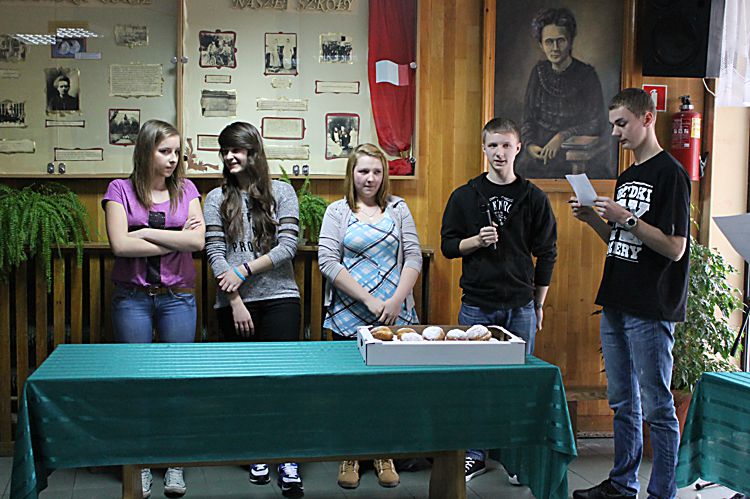 "Powiedział nam Bartek, że dziś Tłusty Czwartek Myśmy uwierzyli, pączków nasmażyli". Tłusty Czwartek, zapowiadający koniec zapustów, od tłustych biesiad zwany tłustym, był obchodzony niezwykle hucznie i wesoło. Ponieważ data Tłustego Czwartku zależna jest od daty Wielkanocy, dzień ten jest świętem ruchomym. Był wstępem do hucznych zabaw i różnych wesołości, które towarzyszyły ostatnim dniom karnawału. Był też zwany mięsopustem ponieważ „mięso opuszczało człeka na długie tygodnie". Wyraz mięsopust oznacza to samo co karnawał a jego pochodzenie wiąże się z włosko-łacińskim carne vale i zwrotami carnem laxare, levare - rozstawać się z mięsem. W przeszłości Tłusty Czwartek zwany też był Combrowym Czwartkiem, bowiem był dniem zabaw kobiecych. Celowały w tych zabawach zwłaszcza przekupki krakowskie. Także młodzież naszej szkoły wesoło i tanecznie obchodziła w tym roku dzień Tłustego Czwartku. SU zorganizował dla wszystkich uczniów konkurs tematycznie związany z tradycją Tłustego Czwartku. Nagrodą dla najlepszych były oczywiście pączki. Konkurs wywołał ogromne emocje. Pączki dla całej klasy wywalczyła Angelika Piszczek (3a).