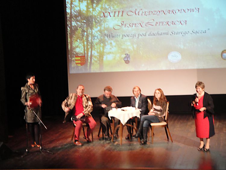 W piątek, 4 października 2013 r. uczniowie naszego liceum udali się do Kina „Sokół” w Starym Sączu na „XXIII Międzynarodową Galicyjską Jesień Literacką”. Było to spotkanie z autorami wierszy polskich i zagranicznych pt. „Wiatr poezji pod dachami Starego Sącza”, organizowane przez Powiatową i Miejsko-Gminną Bibliotekę Publiczną w Starym Sączu. Na sali kinowej zgromadzili się, oprócz naszych licealistów, również uczniowie starosądeckiego Gimnazjum im. Juliusza Słowackiego oraz inni pasjonaci poezji. Swoją obecnością zaszczycili przybyłych czterej artyści: Vladimir Stockman – Rosjanin z Krakowa, poeta, tłumacz i wykonawca poezji śpiewanej, Iryna Bandurovych i Grzegorz Czopyk z Ukrainy oraz Stefan Jurkowski – polski poeta, publicysta, krytyk literacki i dziennikarz. Autorzy czytali swoje wiersze zarówno w ojczystym języku, jak i w polskim tłumaczeniu. Całość prowadził pan Stefan Jurkowski. Po wysłuchaniu górnolotnych wierszy wszystkich poetów, pan Vladimir Stockman (który znany jest w Polsce z występów w Piwnicy pod Baranami w Krakowie), zaśpiewał przy akompaniamencie gitary kilka aranżacji wierszy m.in. Włodzimierza Wysockiego oraz znaną wszystkim „Modlitwę” Bułata Okudżawy. Na koniec spotkania zaplanowano krótką konferencję autorów z publicznością. Opowiedzieli oni szczegółowo, czym jest dla nich poezja, skąd biorą się ich wiersze, jak pogodzić pracę krytyka z pisaniem oraz jak sprawić, by młodzi ludzie chętniej rozwijali swoje talenty pisarskie. Prosili szczególnie, by młodzież nie wstydziła się tworzenia i prezentowania własnych dzieł. Poeci wspominali swoje prywatne doświadczenia i prezentowali własne odczucia, by udzielić wyczerpujących odpowiedzi. Na zakończenie wszyscy otrzymali kwiaty i podziękowania od pani Marii Sosin, dyrektorki starosądeckiej biblioteki.