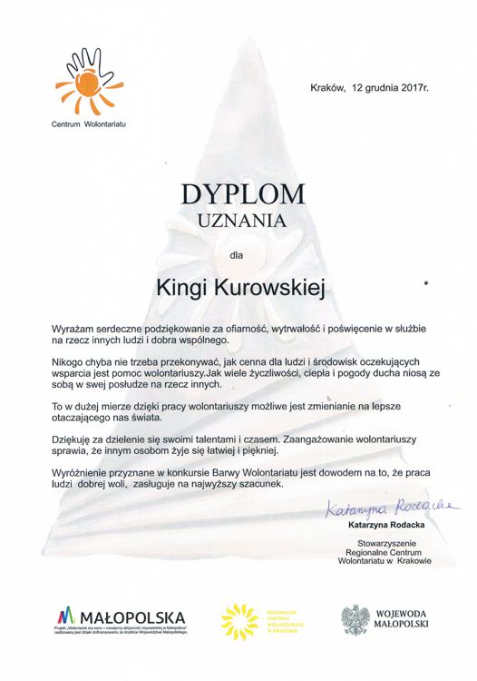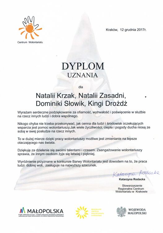Miło nam poinformować, że nasze wolontariuszki zostały wyróżnione przez Stowarzyszenie Regionalne Centrum Wolontariatu w Krakowie. Dyplomy uznania za całokształt pracy w roku szkolnym 2016/2017 otrzymały uczennice klasy II c Kurowska Kinga oraz Sylwia Nowak , które przepracowały odpowiednio 143 i 137 godzin w wolontariacie . Najwięcej czasu poświeciły na pracę ze Stowarzyszeniem Na Rzecz Osób Niepełnosprawnych „Gniazdo”, gdzie wspólnie z podopiecznymi przygotowywały przedstawienie teatralne. Kinga i Sylwia angażowały się również w wiele innych akcji.