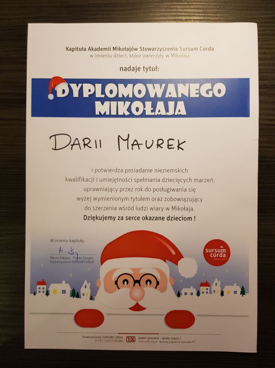 Uczennica klasy II b Daria Maurek uzyskała tytuł Dyplomowanego Mikołaja nadawanego przez Stowarzyszenie Sursum Corda za pomoc w przygotowanie paczki dla jednego z dzieci, podopiecznych Sursum Corda. Paczka zawierająca miedzy innymi stolik do pokoju dotarła już do adresata a Daria pomogła w spełnieniu marzeń. Gratulujemy.